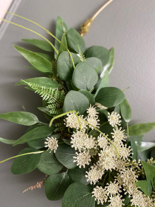 18" gold hoop with artificial eucalyptus, ferns, white queen ann flowers and finished with moss.